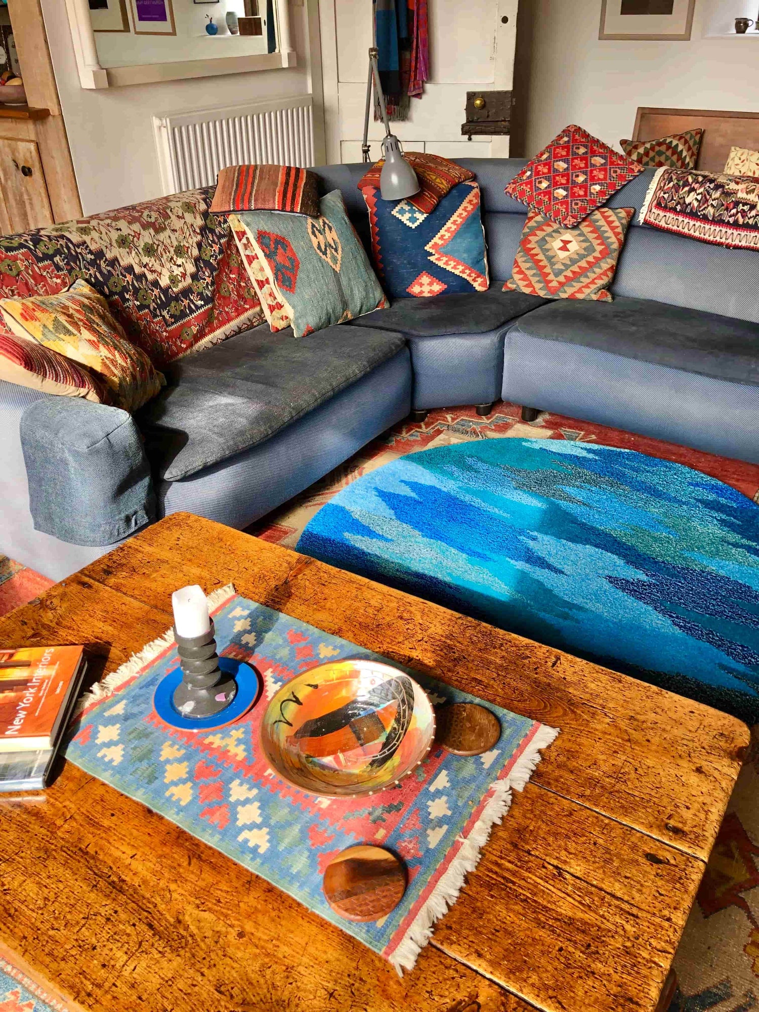 The blue Ocean rug to the right is make up of 20+ blue wools, I had varying amounts left from different projects and new shades too all made from colours saved and made into something beautiful for the home.