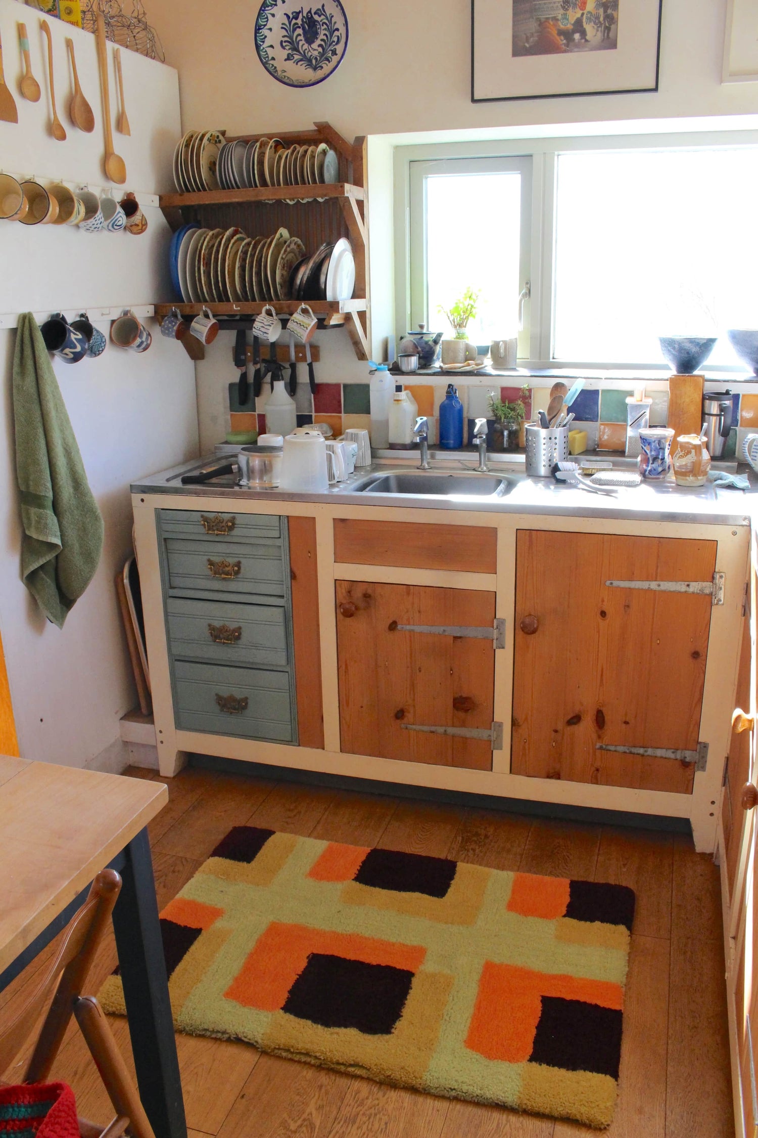 I love to choose a rug that includes colours found in my wall art, but isn't too matchy matchy. The pastel cheque rug below is a great addition to nice person's kitchen as the orange matches the tones of the woods, and the mustard yellows tie in with the kitchen tiles too!