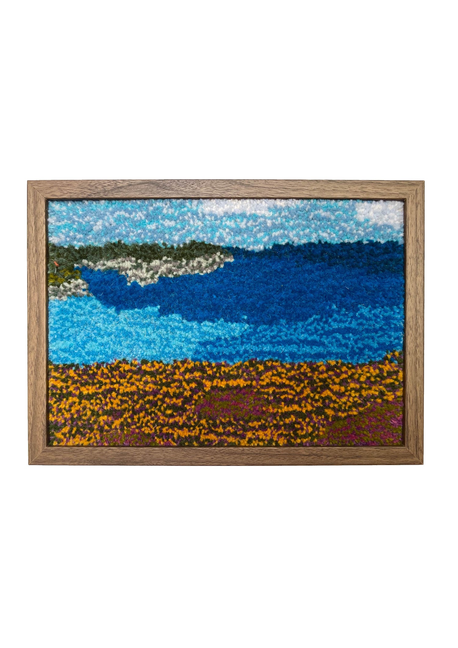 This tufted wall hanging is inspired by the walk over to the Nanjizzle beach, the aquamarie turquoise water next to the yellow and purple heather is so amazing to see.
