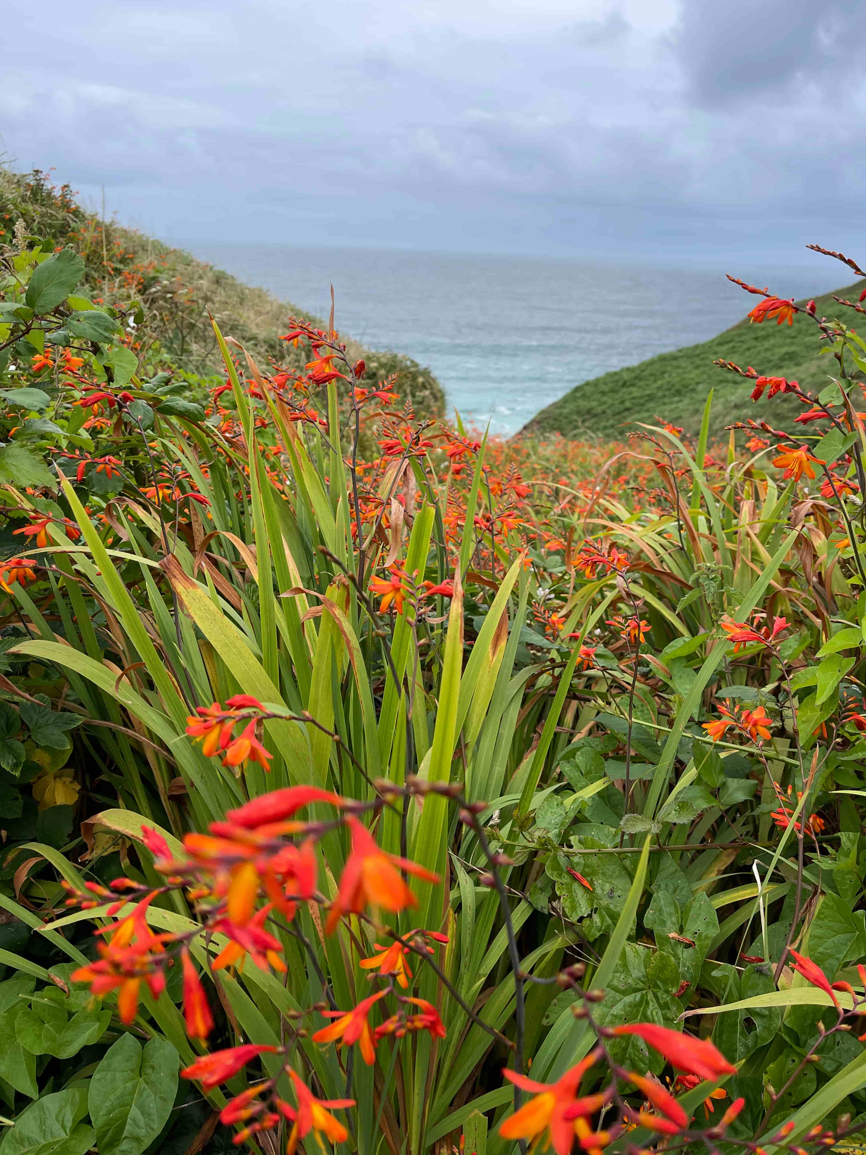 This tufted wall art was inspired by the beautiful crocosmia growing on the hillside down. The brilliant green leaves and folliage next to the piercing warm orange flowers compared to the grey sky and blue sea was so spectacular and so evocative fo this part of Cornwall.