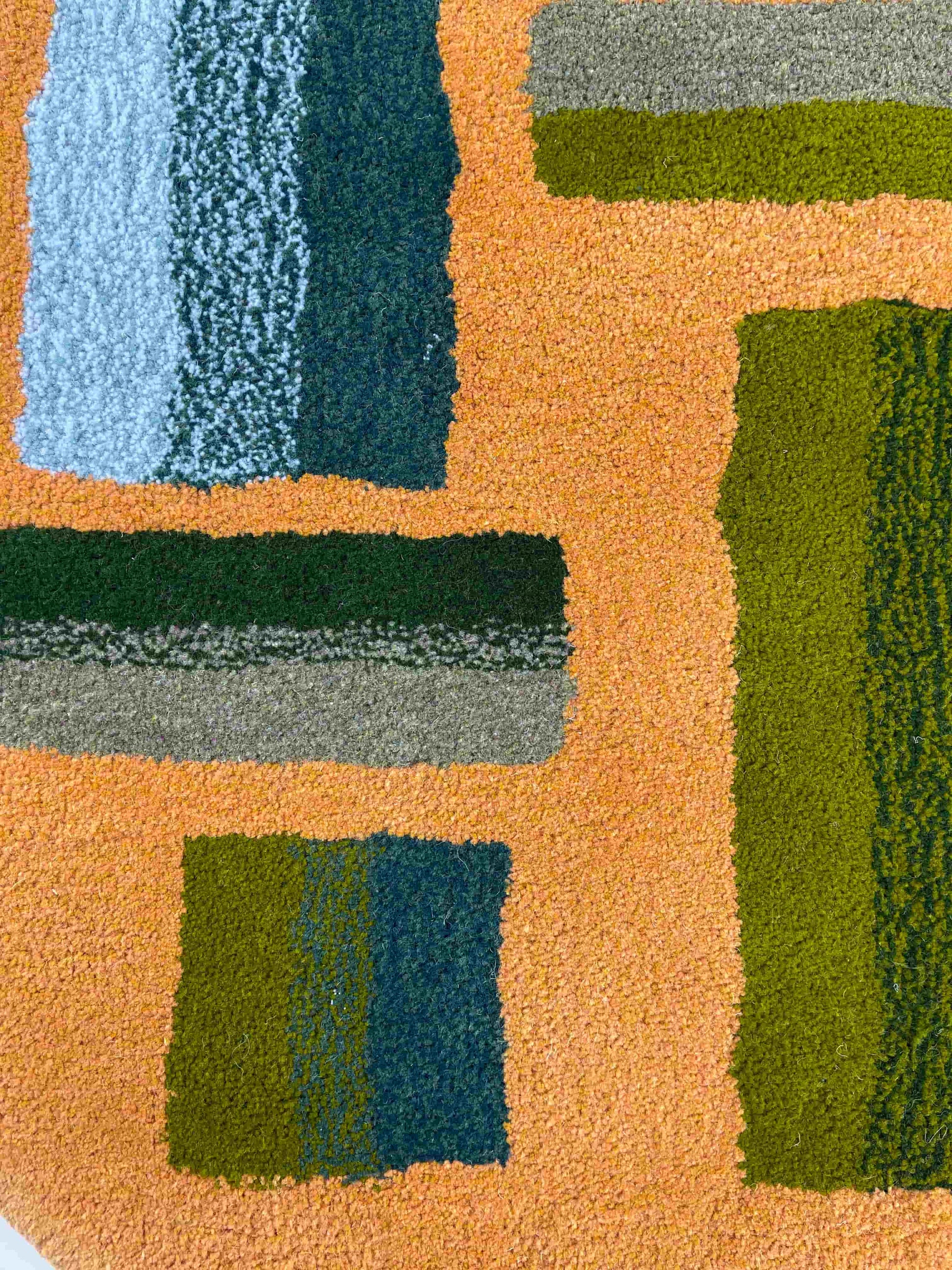 This handmade rug is tufted with an abstract colour block gradient design. Tufted in ochre, mustard yellow, forest green, aqua, sage green, dark green, moss green and teal rug wools.