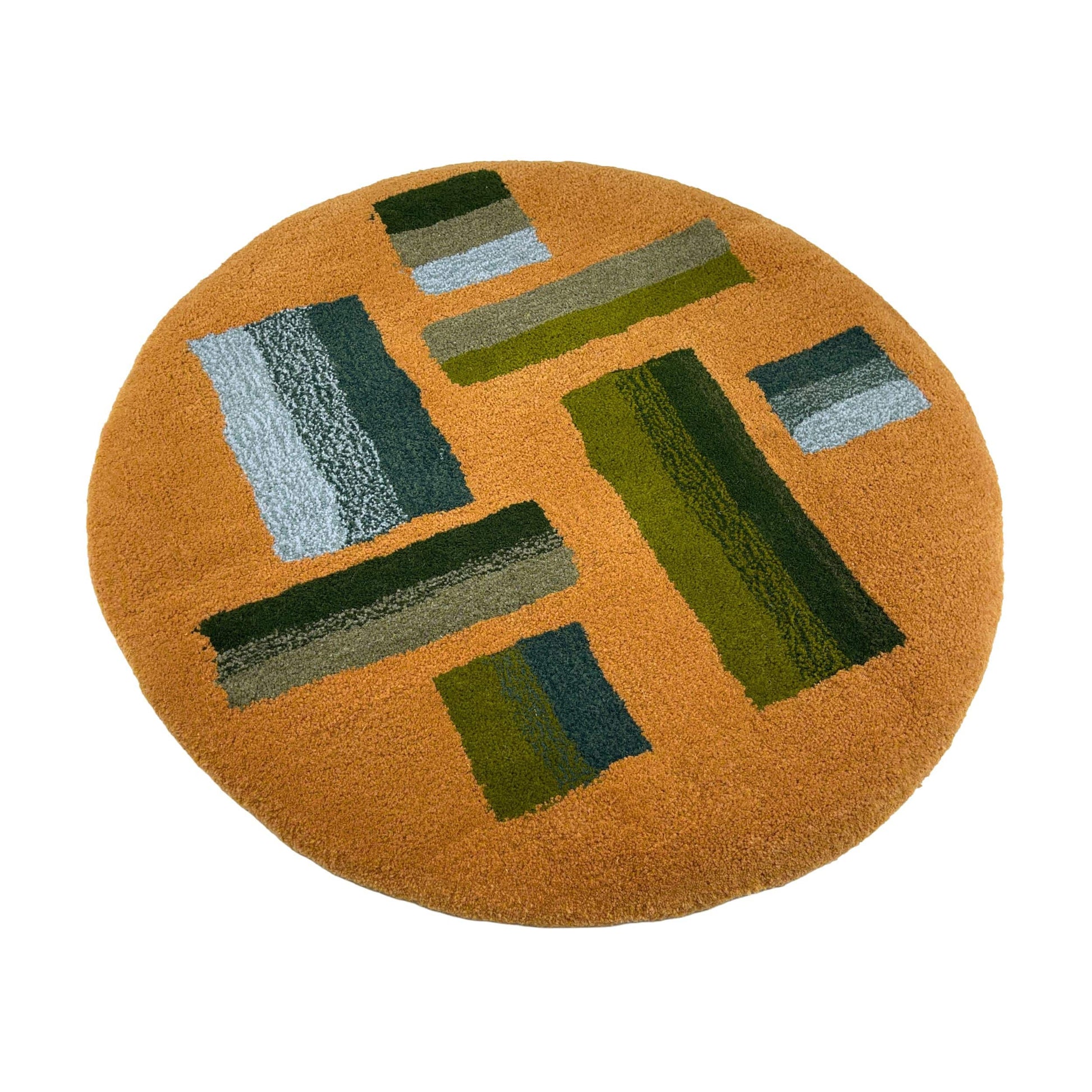 'Hitomi' Hand tufted ochre mustard, dark green and teal circular small tufted rug