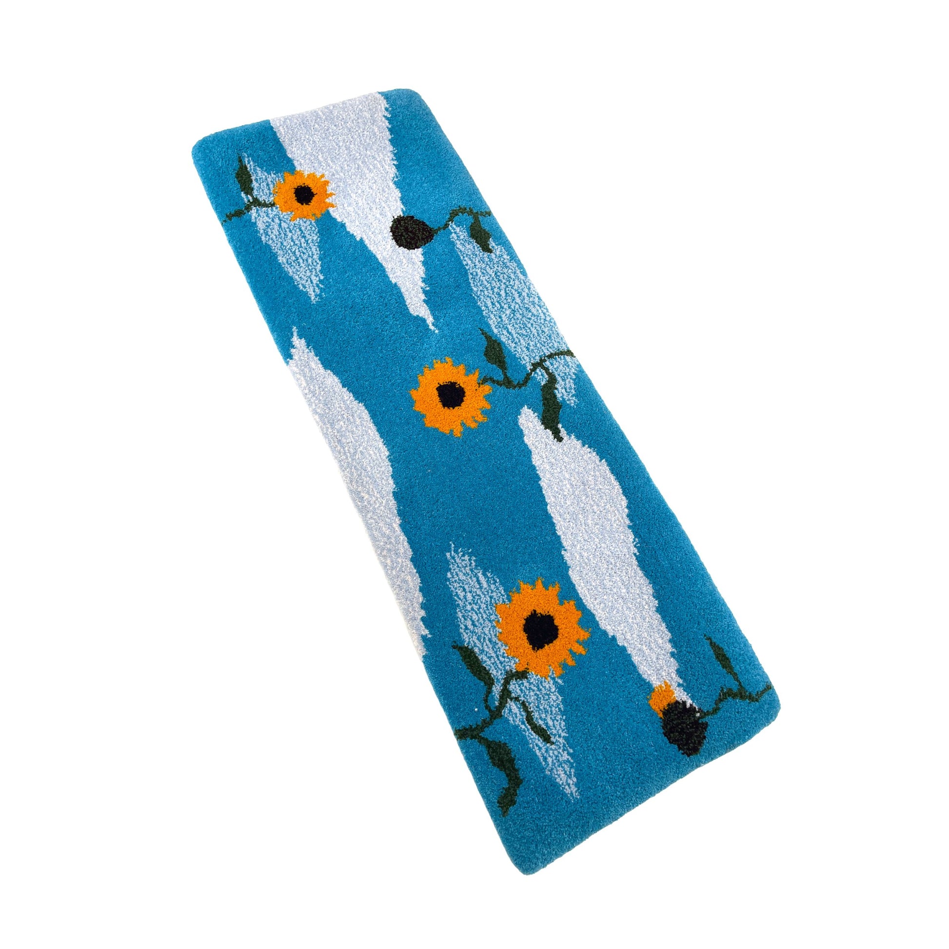 Handmade in my garden studio with sustainably sourced RUG WOOL from the UK. This tufted rug is made from rug wool so it is durable and hardwearing for you to walk on. Being a small area rug it would be great in your bedroom, living room or hallway. This hand made rug a cloud background scene with bright yellow sunflowers peeping in from the sides all tufted in a graphic style that will make your room pop.