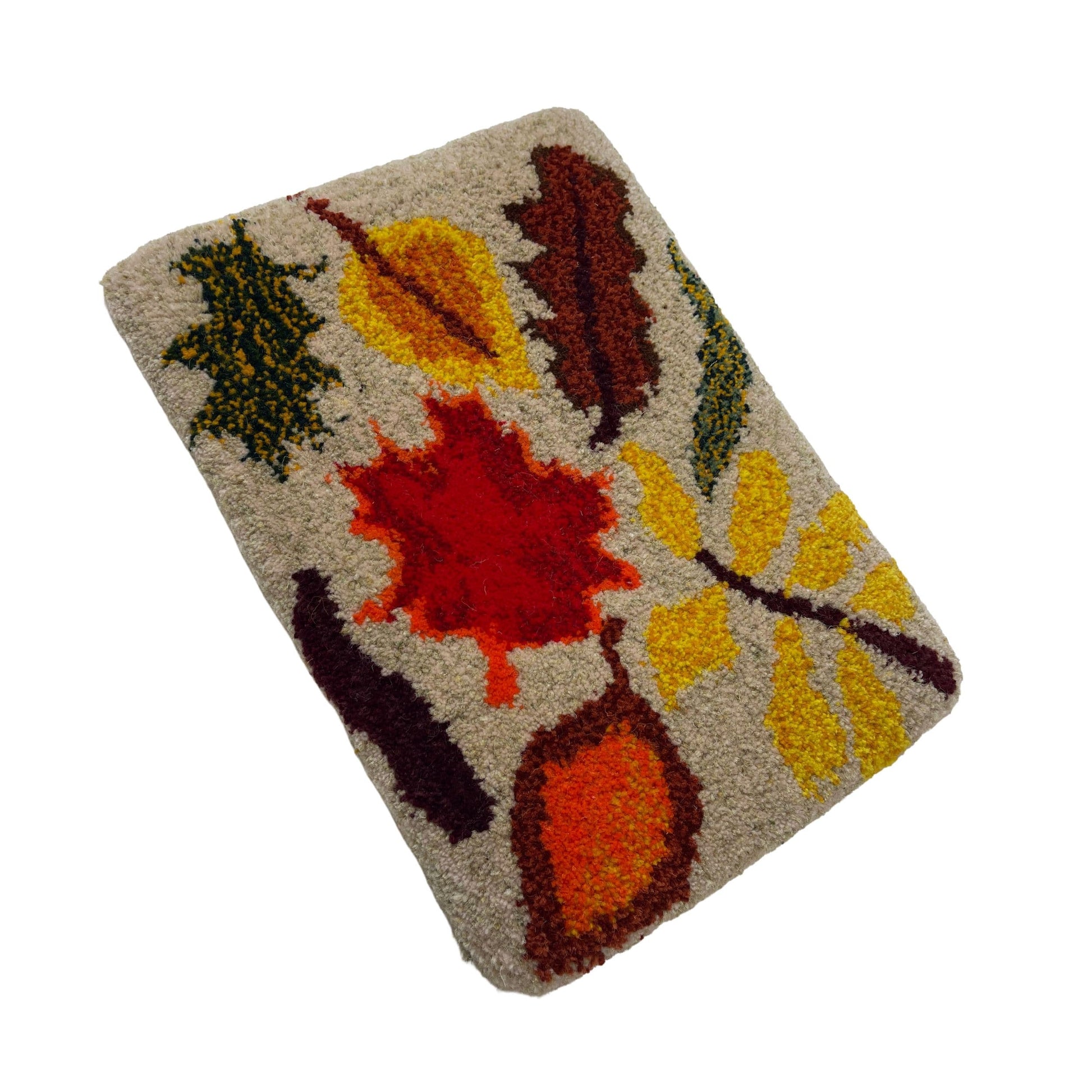 3. The Autumn Leaves tufted wall hanging is tufted with bright yellow, mustard yellow, red, rust orange, burgundy, brown, sage green and cream rug wools in a botanical leave design.
