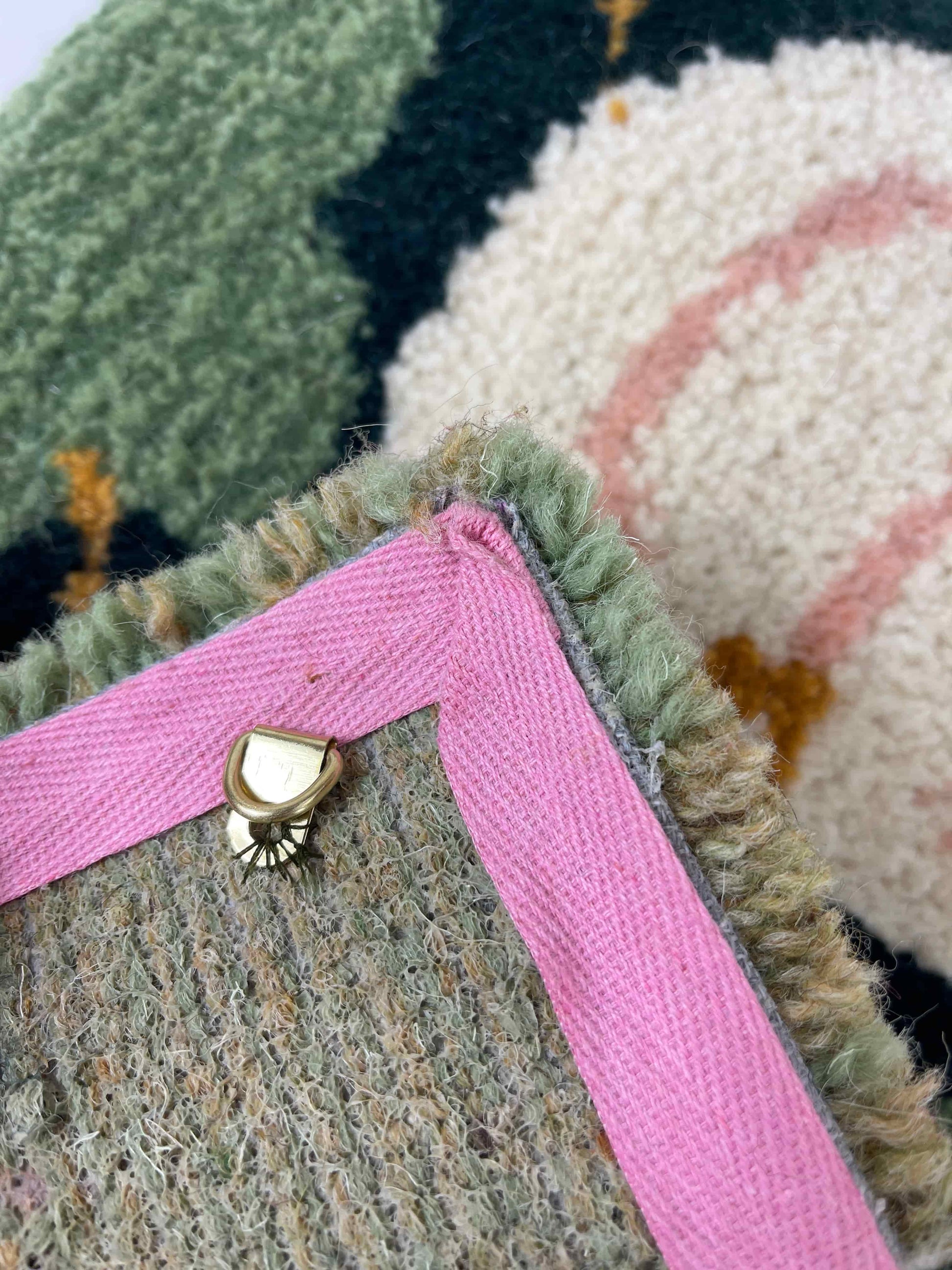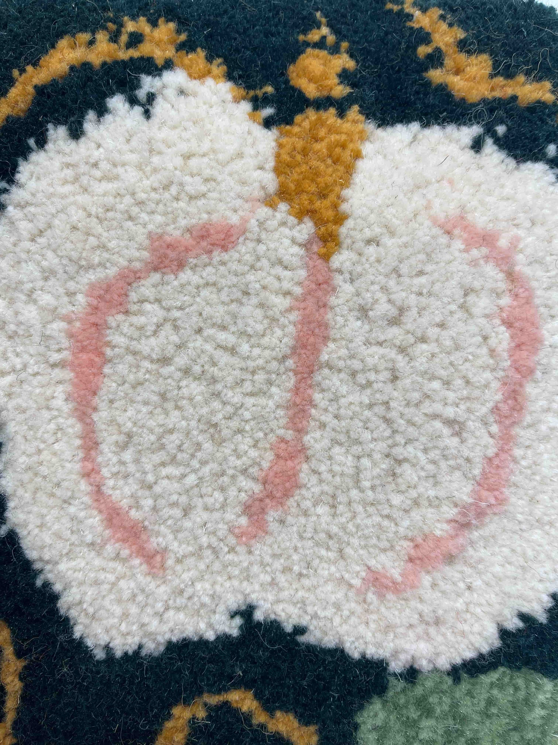 2. The White Pumpkin tufted wall hanging is tufted in dark green, sage green, forest green, gold yellow, light pink and cream rug wools in a cooler dynamic colour palette.